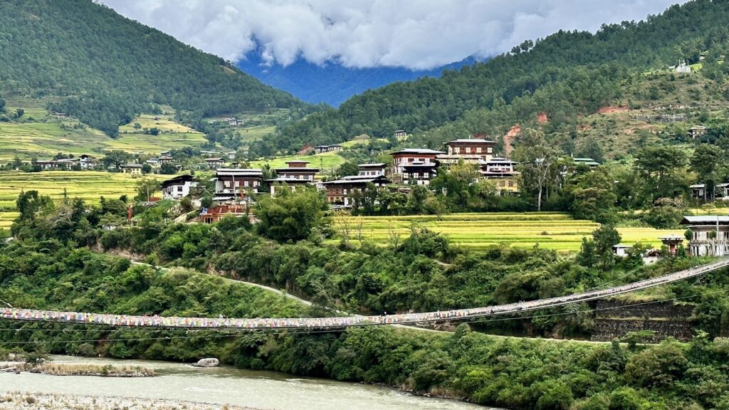 The day opens with an easy hike to Khamsum Yulley Monastery and a gentle rafting journey along the glacial river. We explore Punakha Dzong, the Palace of Great Bliss, and share lunch with Dasho Tshering Dorji in conversation about Bhutanese values. As evening falls, we cross the suspension bridge and gather at a local farm home for song, firelight, and a home-cooked meal.